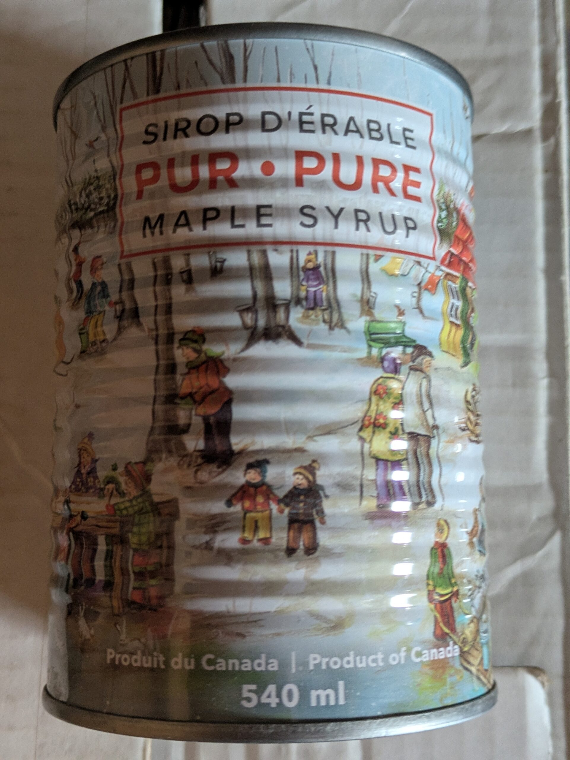 100% Quebec Maple Syrup. This dark amber Maple Syrup, is from Quebec. It has been used in baking, and for a topping for pancakes, french toast and waffles. Comes in a 540ml can.